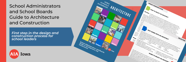 The Iowa Schools Guidebook on Architecture is a new, free resource from AIA Iowa. Created for Iowa School Administrators and School Boards, it will serve as a guide for the architectural design and construction process in Iowa for both new and existing buildings. The Guidebook covers topics from selecting an architect to project delivery methods to considerations for design and construction.