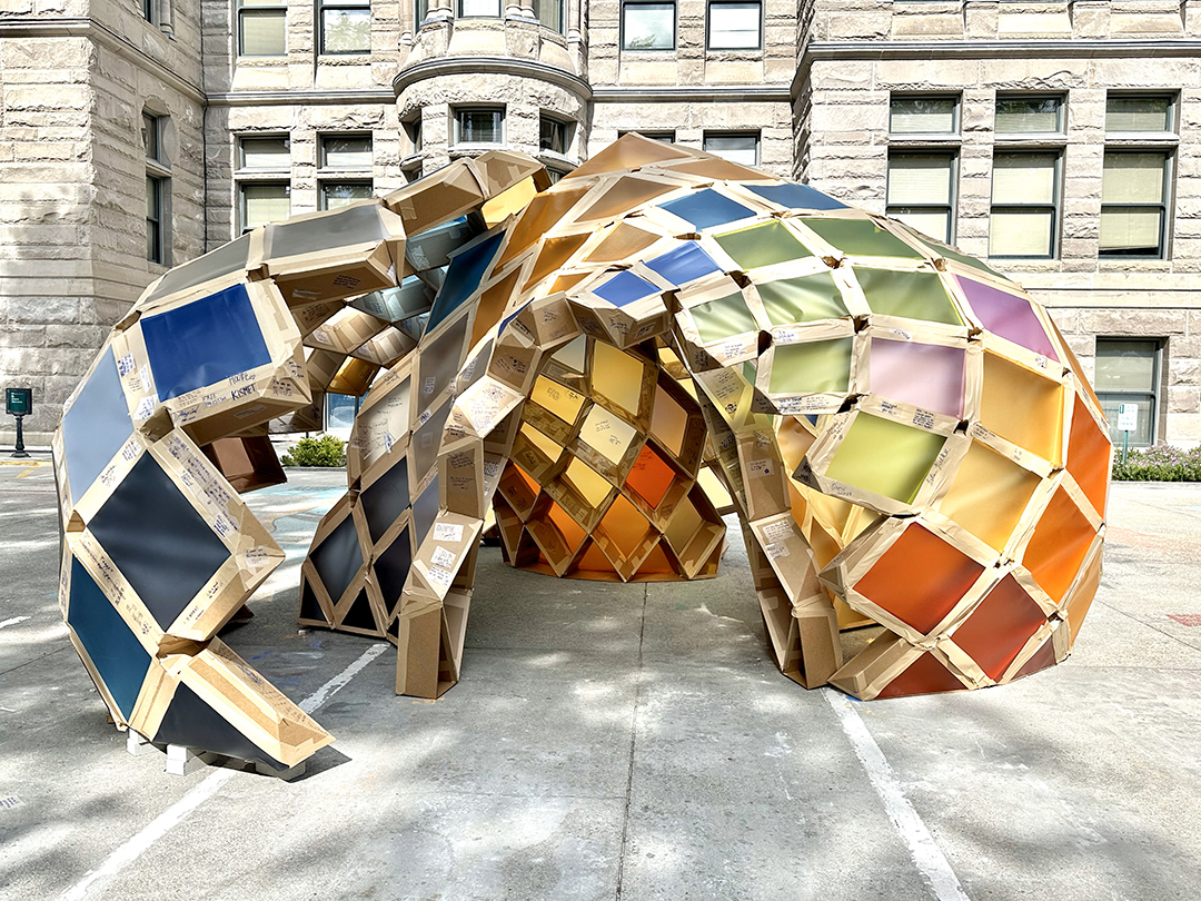 Building from cardboard allows the project to sidestep the involvement of a religious institution in the exploration of sacred space. As such, both the architectural and social elements can be rethought or reimagined. The cardboard cells are designed with parametric modeling, laser cut, and then folded and assembled by volunteers. It brings together the ancient technology of bricks and arches with high tech computer modeling. The cells are covered in colored panels, a reclaimed material donated by the company 3Form. This reference to stained glass windows becomes an occupiable kaleidoscope of colored light, a convergence of the historical with experiential innovation.