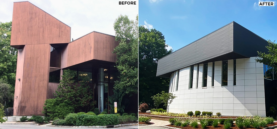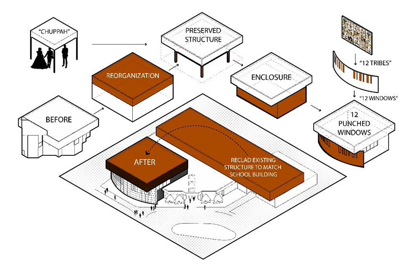 Clerestory windows and a Jerusalem stone clad curving wall below the roof box refocus and soften the space to visually reference the sacred Western Wall in Jerusalem. To provide visual continuity to their original space, original wood paneling was reinstalled in a new horizontal orientation. The team’s design for the ark has multiple layers of symbolic meaning and the eternal flame was selected as a small crystal ray of light to delicately complement the ark. The exterior of the new sanctuary was reclad with zinc, matching the synagogue’s classroom wing and provides a new identity to the front of the building.