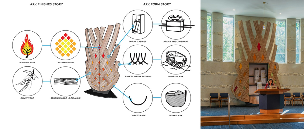 These three appearances are reference and layered into the design for Scarsdale Synagogue’s Torah Ark to help “complement the musical, liturgical, and pedagogical goal of helping us to cultivate an inner relationship with the Diving,” as the Synagogue’s Rabbi had described.