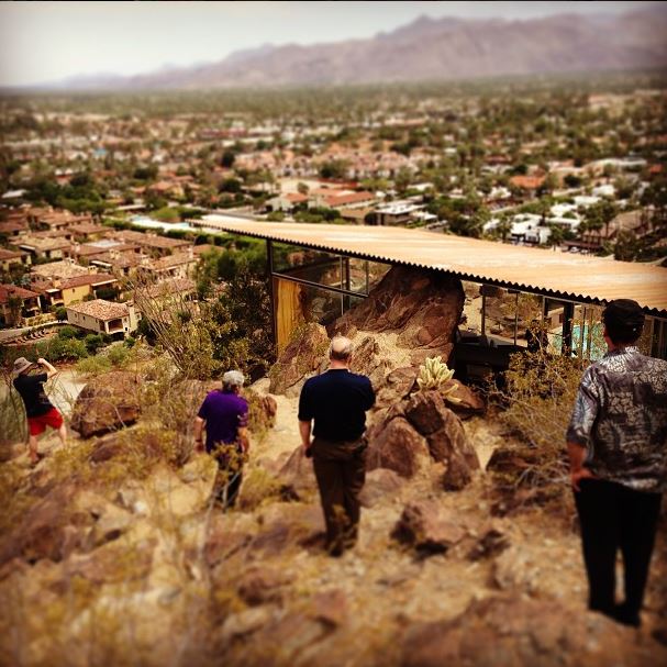 One architect taking a photo of four architects taking a photo of the Frey House overlooking the Coachella Valley.