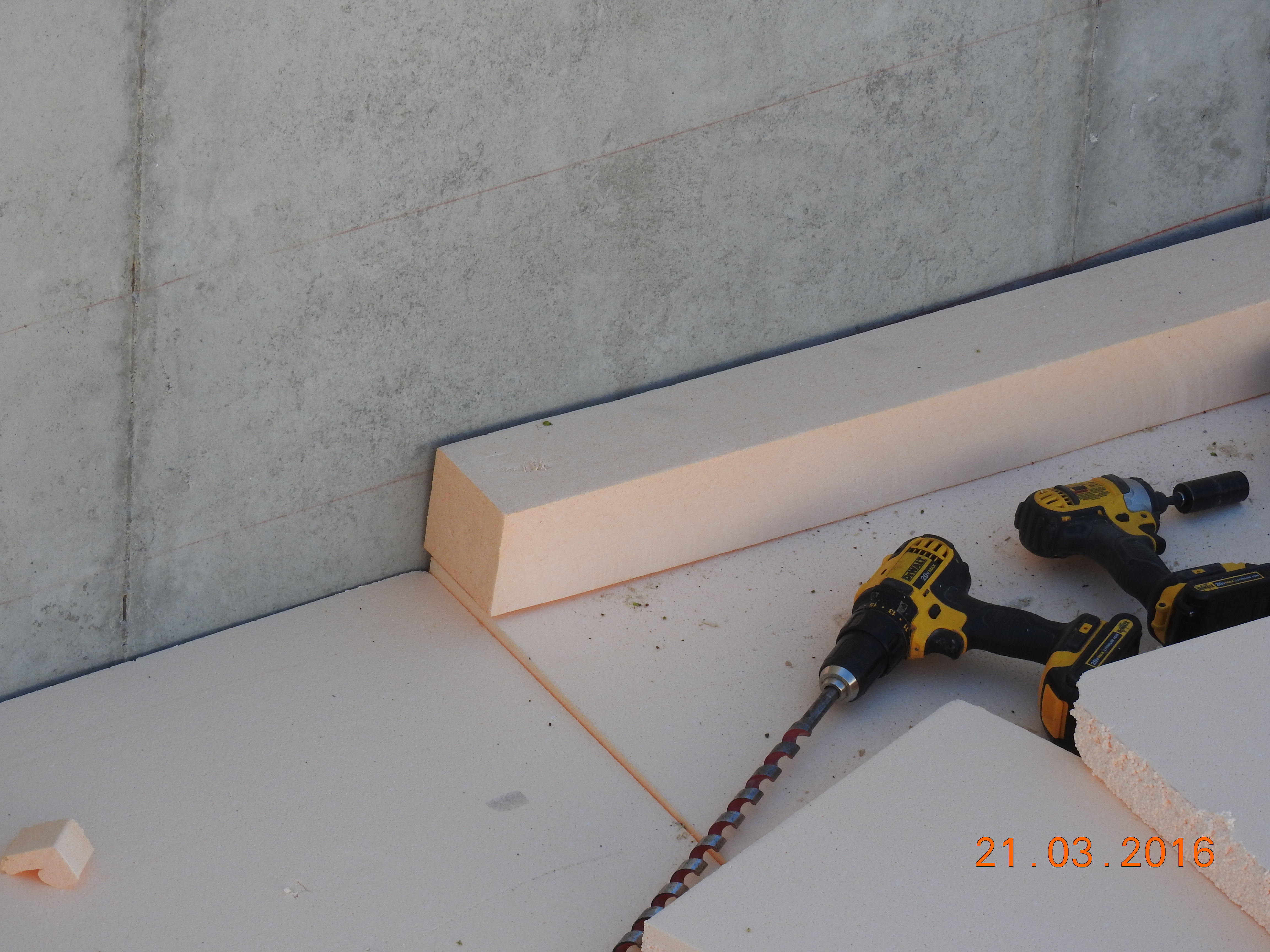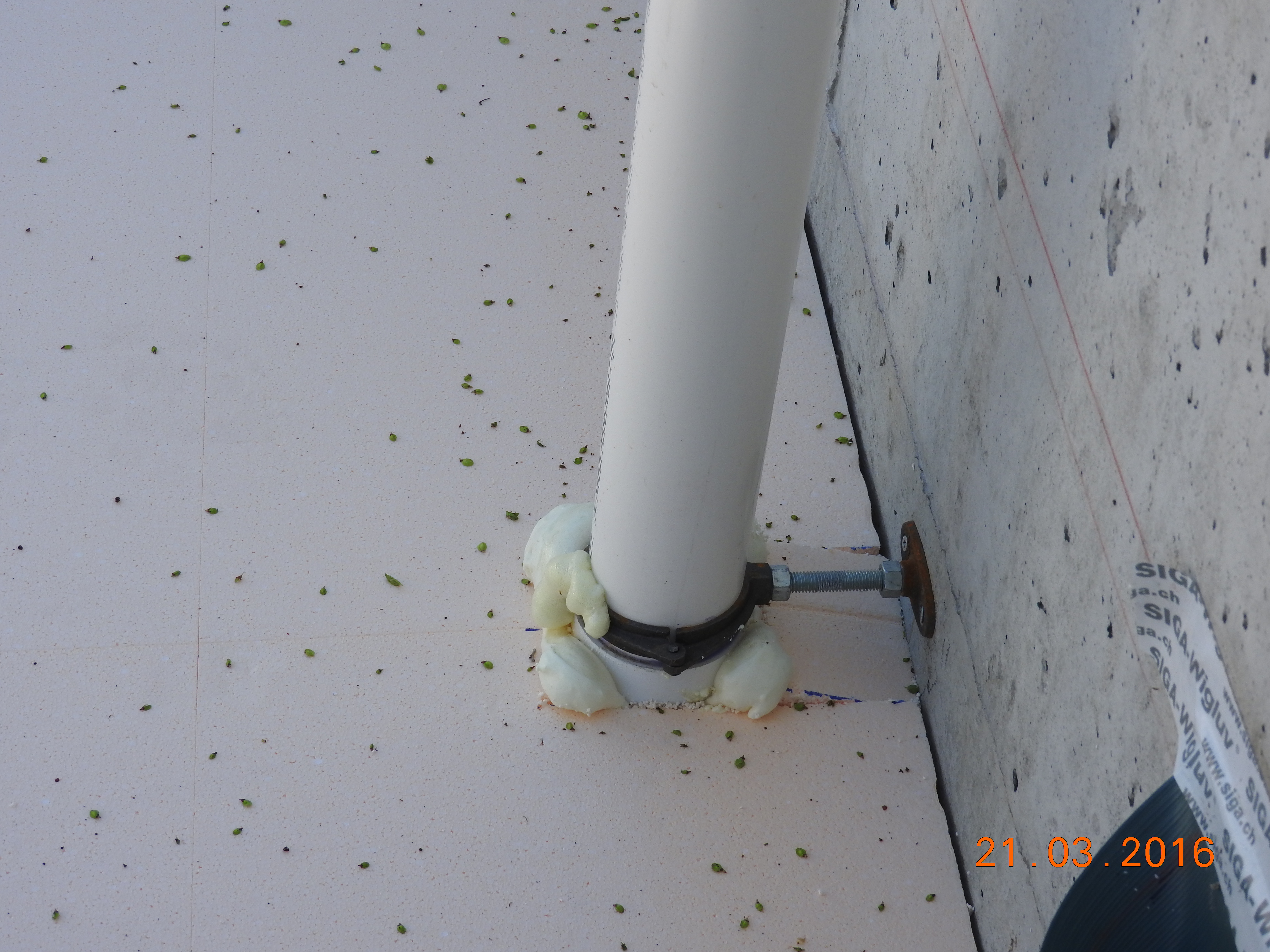 A 15 millimeter vapor barrier is installed over the insulation and sealed to the foundation wall with adhesive tape.