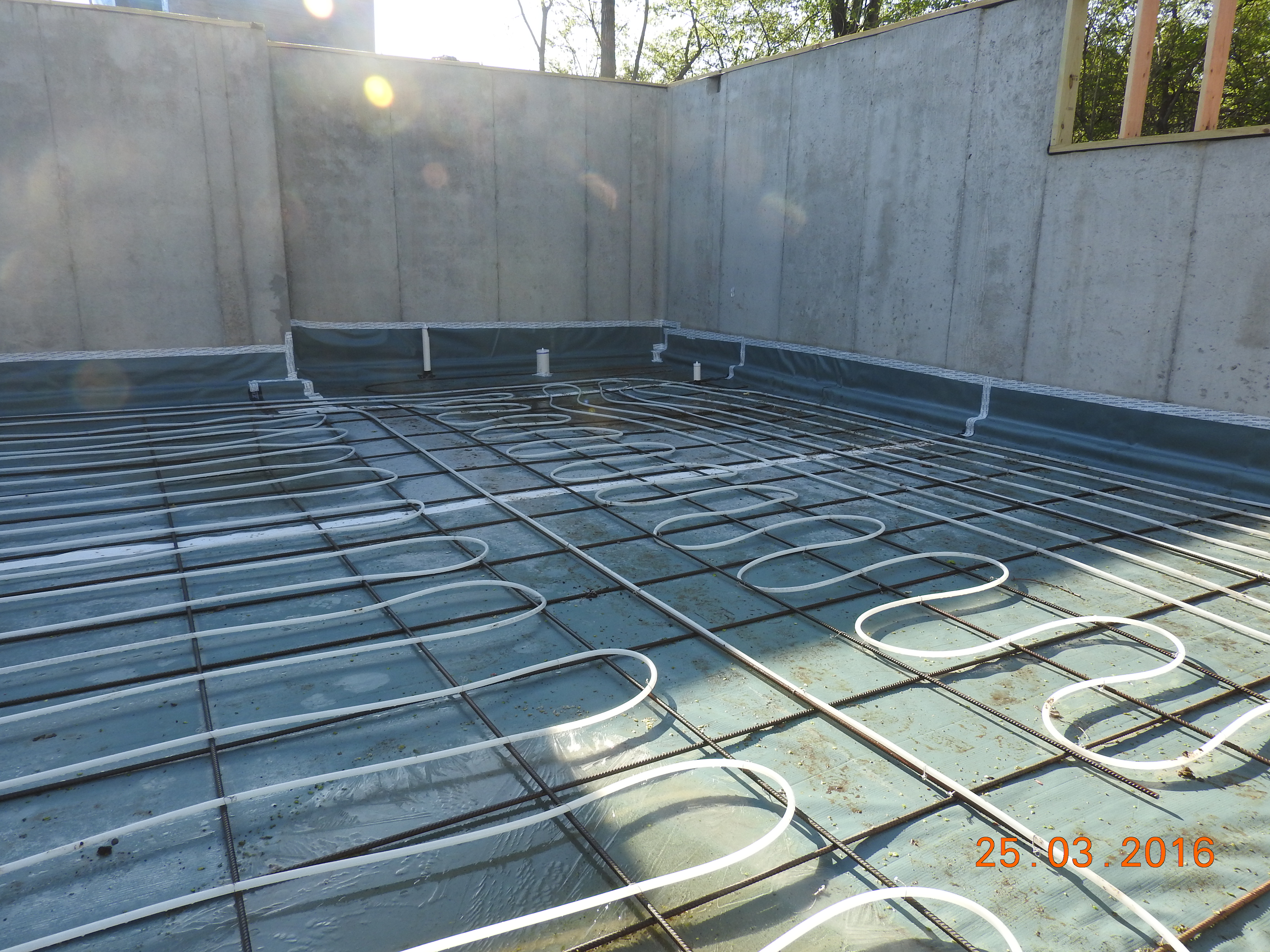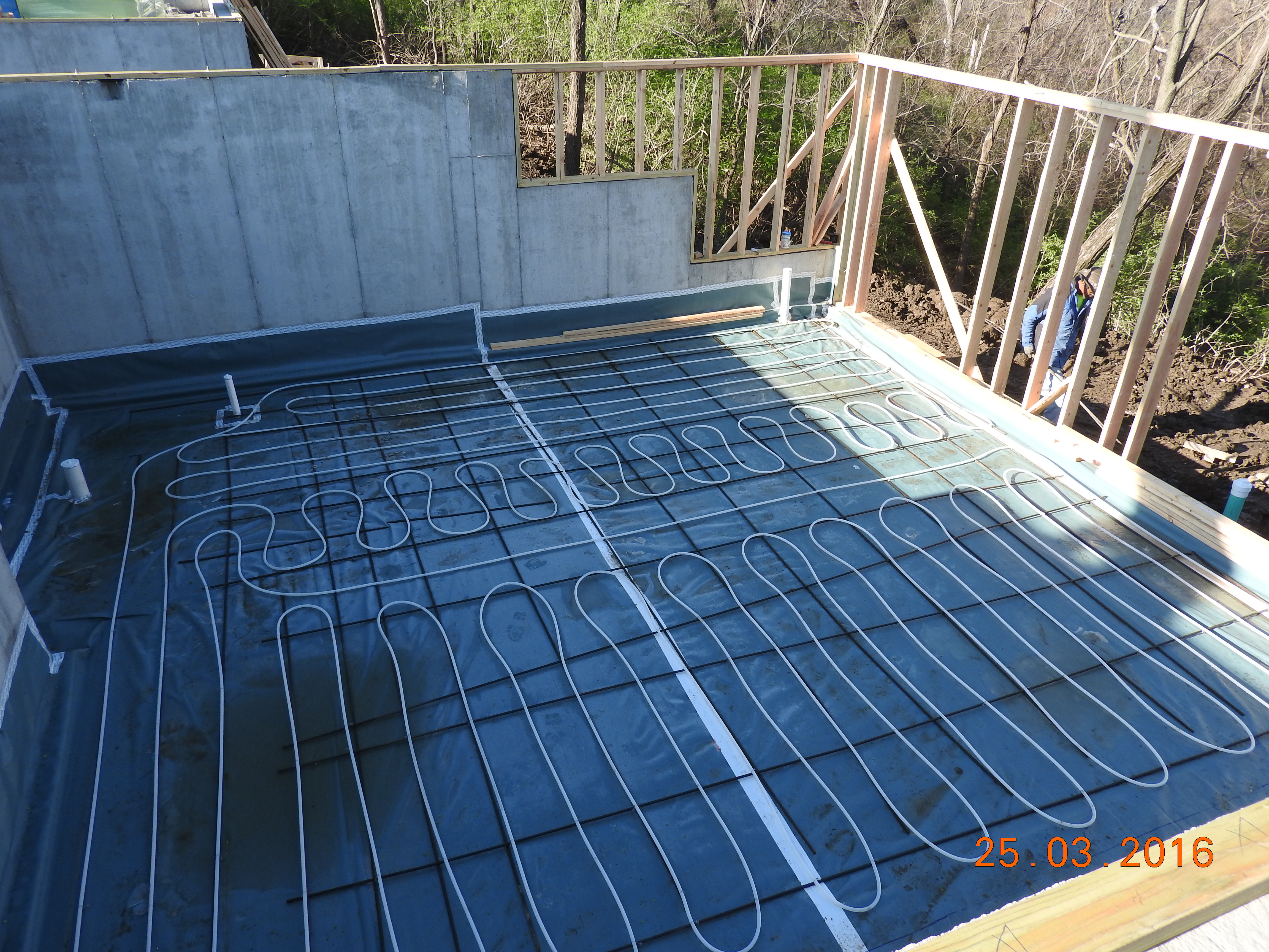 The rebar and radiant floor system are installed over the vapor barrier.