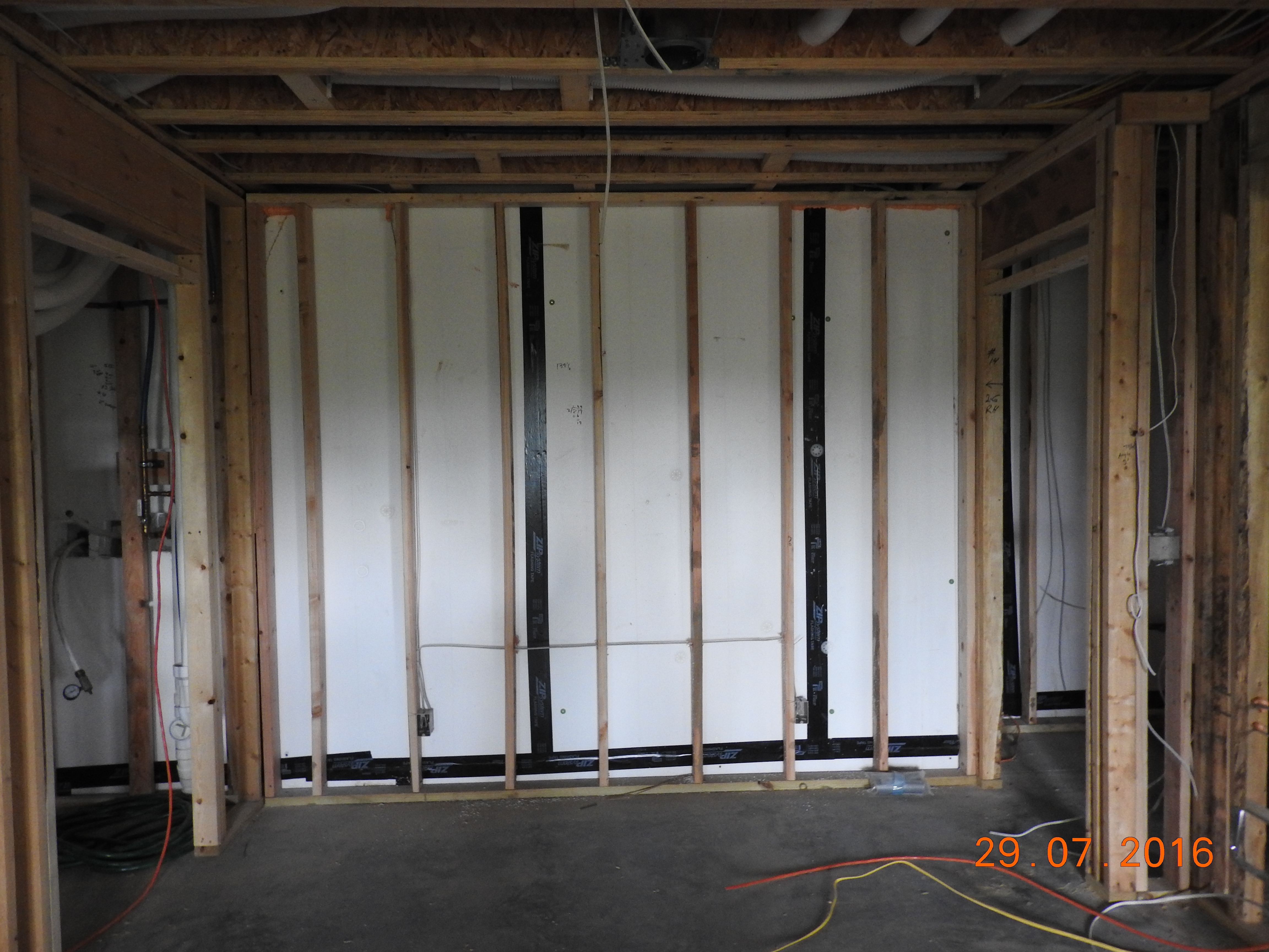 The interior wall of the foundation would later be clad with 4 inches of EPS (R-16) directly to the inside face and taped to be continuous. A 3 1/2 inch interior finish wall with batt insulation (R-13) would then be installed in the cavity for a “nominal” total of R-29. Ideally, the insulation would be on the outside face of the foundation wall, but there were concerns of its long term durability and potential for damage during construction.