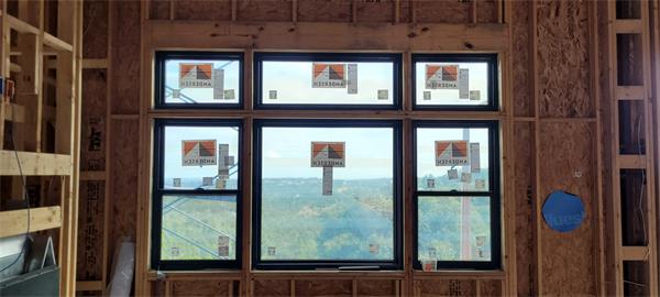 In the open concept living room, a large window combination made of picture and single-hung windows from the Andersen 100 Series product line makes the most of the breezes and views. Photo courtesy of Barley | Pfeiffer Architecture.
