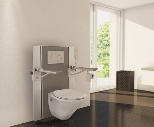 Height adjustable toilets – Height adjustable toilets are mounted on an innovative adjustable track system that allows users to easily change a toilet’s elevation by up to approximately 15 inches (400 mm). The toilet’s height is controlled by either a manual hand-crank option or by a hand-held device that controls an electrically powered actuator. This means residents can position the toilet at their optimal desired height, even while seated on the toilet.