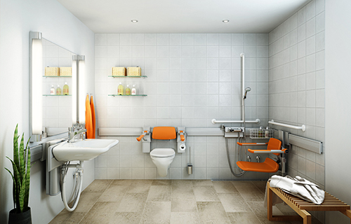 Sinks and shower fixtures – Sinks and other bathroom accessories such as wall-mounted shower seats and support arms can be mounted on attractive, high-strength aluminum rails that allow easy adjustment up, down, or sideways. Repositioning is controlled by simple easy to turn adjustment handles, enabling residents or maintenance personnel to adapt the layout of a bathroom to suit the varying size and mobility requirements of each individual user.