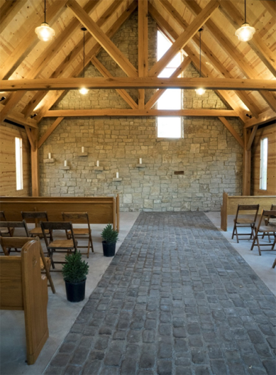 Stepping inside the gathering space reveals a heavy timber frame of white oak, influenced by the many barns Dutton spent time in as a child. The frame was raised in a single day by local Amish craftsmen with church and local community present. The narrow windows spaced along each side evoke a church, yet are modest obscured amber-colored glass. While the barn-inspired frame is familiar and expected, the center aisle, rendered in bricklike stone pavers, is shifted off-axis to the right and terminates in a tall window that engages the slope of the ceiling. Where the single high window in the stone end wall lifts the eye, we are re-grounded by a horizontal composition of several rustic ledges emerging from the wall to allow for candles. The asymmetry of the space is a simple surprise that reminds us the divine can manifest in delightful and unexpected ways.