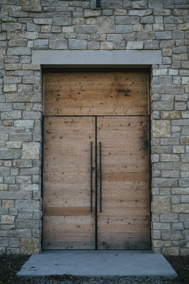 The simple steep-pitched gable-roofed building reminds one not only of the archetypal form of a church but of a building itself: sheltering, familiar, and comforting. The material palette is uncomplicated and elegantly executed and detailed. The exterior sidewalls are cedar shake siding, and the end walls are of gray limestone laid in a semi-random pattern that recalls the rustic practicality of the region’s agrarian buildings and evokes the image of 19th-century farmers gathering and stacking the stone that they could reasonably gather nearby. The entry doors and opaque transom of solid knotty horizontal planks, outfitted with tall dark bronze door pulls, hint that this building might not have been here for a century or more, as it appears at first sight.