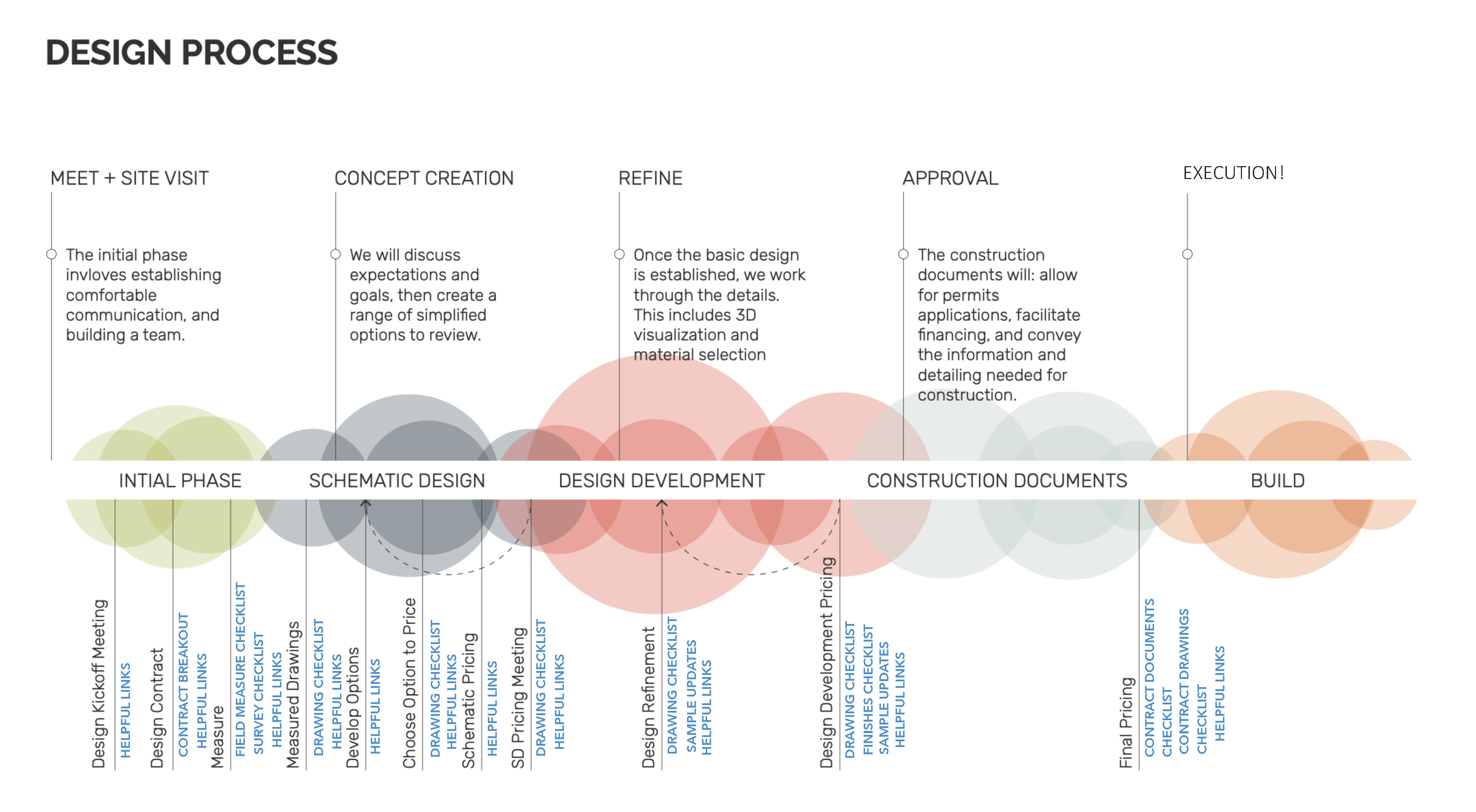 A project timeline contains links to connect our team members with valuable resources at every project phase. © Arx Design Collaborative
