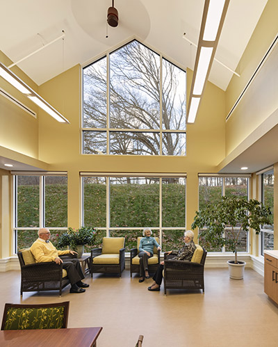 A majestic 100-year-old oak organizes a 12-unit addition to Duncaster Retirement Community’s Assisted Living Memory Care Neighborhood in Bloomfield, CT, symbolizing strength, endurance, protection, success and stability to its residents.