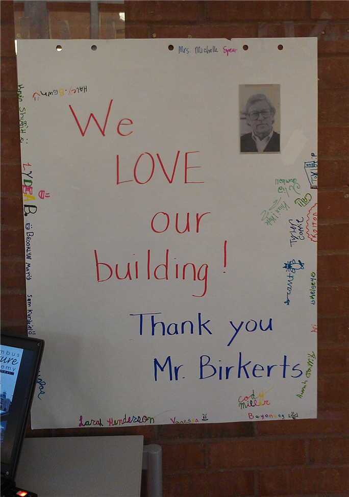 One of our first stops on Day 2 of the 2012 AIA Committee on Design Spring Conference in Columbus, Indiana was a tour of the interior of Lincoln Elementary School. We were privileged to have Gunnar Birkerts himself lead us through the spaces of the school. It was clear that Mr. Birkerts was moved when he discovered this handmade sign during the tour, which reads, “We LOVE our building! Thank you Mr. Birkerts.” Soon after finding the sign, he popped into the adjacent classroom to chat with the young students and their teacher. He received a warm reception and I found it very heartwarming how starstruck some of the students appeared (a handful approached Mr. Birkerts later to ask him for his autograph).
