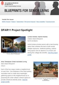 Blueprints for Senior Living is the AIA Design for Aging's quarterly electronic newsletter. The goal of this publication is to provide information that helps our members better understand upcoming events and their content and offer access to related organizations and articles on pertinent topics concerning seniors housing and care. We aim to let you, our members, know what is happening in the community as well as offer you a platform for sharing your expertise. View the newsletter archive >