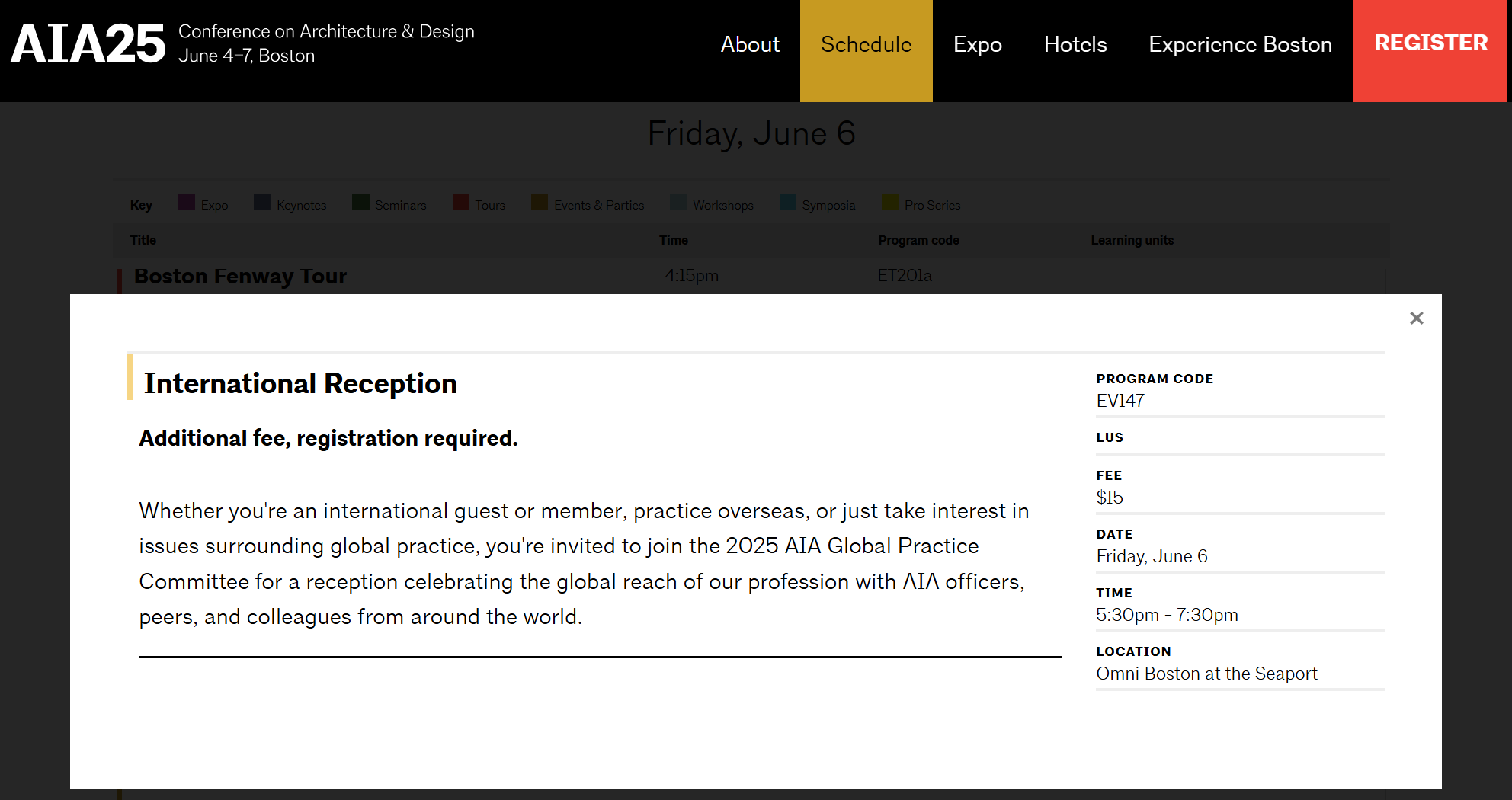 Schedule - AIA Conference on Architecture & Design 2025Whether you're an international guest or member, practice overseas, or just take interest in issues surrounding global practice, you're invited to join the 2025 AIA Global Practice Committee for a reception celebrating the global reach of our profession with AIA officers, peers, and colleagues from around the world.