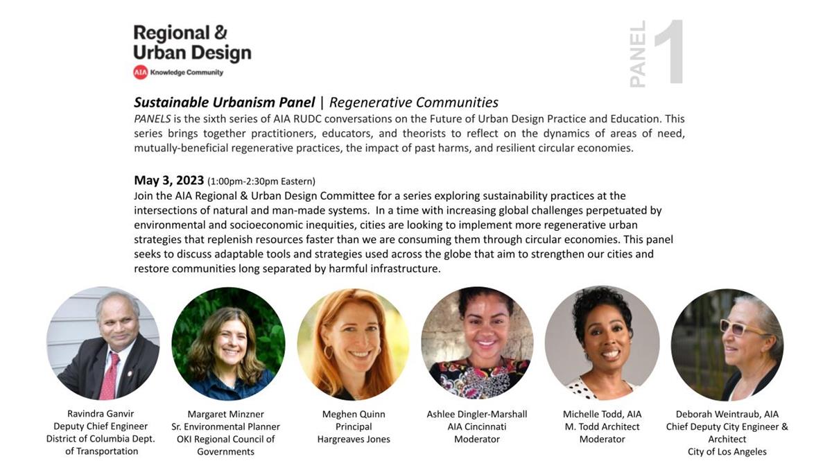 Join the AIA Regional & Urban Design Committee for a series exploring sustainability practices at the intersections of natural and man-made systems. In a time with increasing global challenges perpetuated by environmental and socioeconomic inequities, cities are looking to implement more regenerative urban strategies that replenish resources faster than we are consuming them through circular economies. This panel seeks to discuss adaptable tools and strategies used across the globe that aim to strengthen our cities and restore communities long separated by harmful infrastructure.