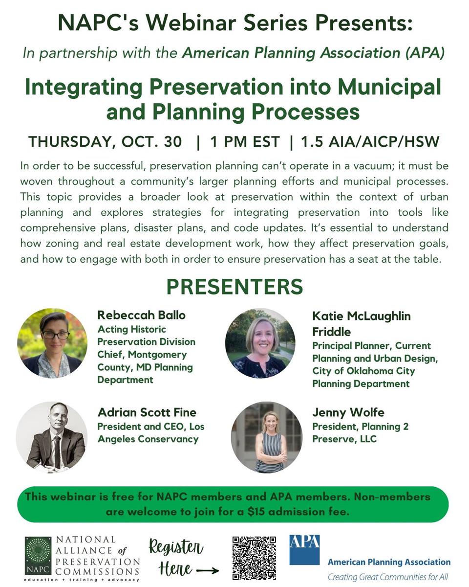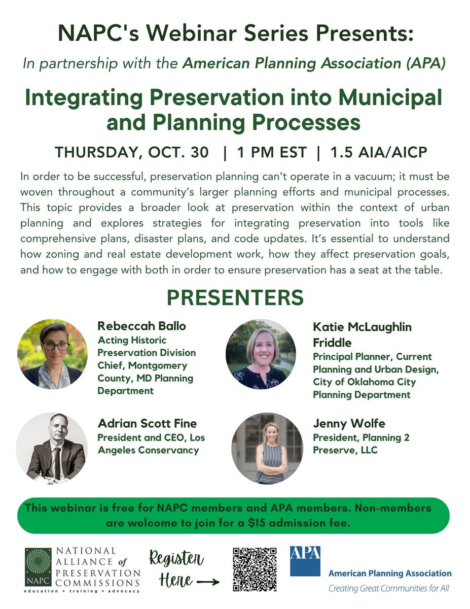 The National Alliance of Preservation Commissions (NAPC) will host a webinar on October 30, 2025, 1-2:30 pm ET that will also be recorded and available on-demand. It is eligible for 1.5 AIA/HSW credits! More information in the flyer below and you can register here. Just as an FYI, NAPC hosts a monthly webinar series on a variety of topics pertinent to historic preservation at the local level. All webinars are eligible for AIA credits and many also are HSW. These webinars are free to NAPC members. We offer both individual and organization level memberships. Learn more about membership here.