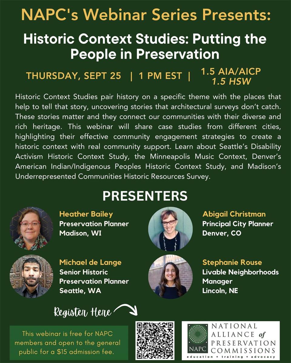 The National Alliance of Preservation Commissions (NAPC) will be hosting a webinar, Historic Context Studies: Putting the People in Preservation, which will take place on Thursday, September 25 from 1-2:30 pm ET. The webinar can also be viewed on-demand. It is eligible for 1.5 AIA/HSW credits. Learn more below! NAPC has a monthly webinar series that is eligible for AIA credits, many of which are also HSW credits. Learn more at https://www.napcommissions.org/
