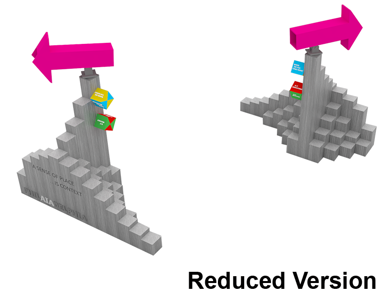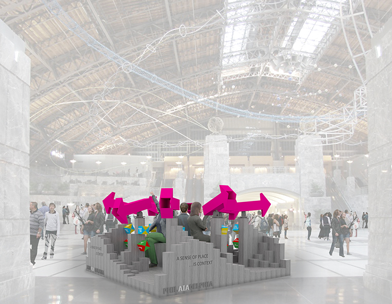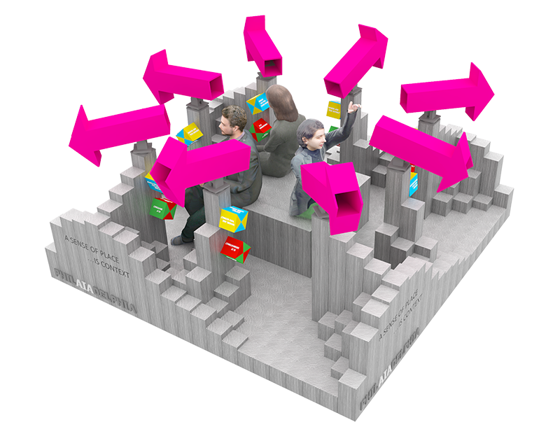 Architects typically envision how their designs would fit within the context of a given site. Frequently, we create diagrams with abundant arrows to indicate how a design fits into the existing and proposed circulation network. But, this can be a very abstract exercise. Do we pause to imagine what it’s like to experience the environment incrementally, as part of the user experience? “A Sense of Place. . . Is Context” proposes we view the surrounding environment of a site cinematically, analyzing where we’ve come from and where we are going. Once sitting inside of the installation, a convention attendee would view the surrounding environment through oversized “prop” arrows in single frame views to determine whether destinations are inviting or discouraging to a potential user.